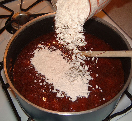 Faites fondre la graisse végétale dans une grande casserole puis mélanger le sucre et la mélasse. Ajoutez toujours dans la casserole la farine, le sel, le bicarbonate de soude, la noix de muscade, le gingembre, la cardamome et les clous de girofle en poudre graduellement.
