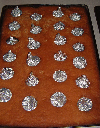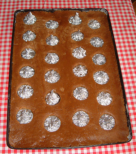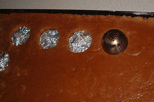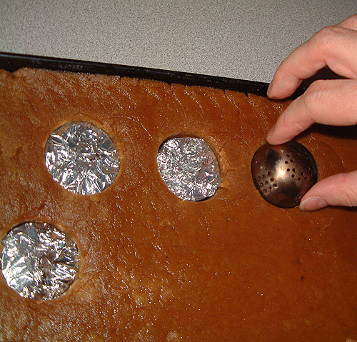 - Préparez une première fournée de pain d épice avec la recette ci-dessus) Etalez votre pâte puis prenez votre petite boule à thé et faites les 24 trous dans la pâte, puis comblez les petits trous avec vos ronds en aluminium que vous aurez préalablement préparés.