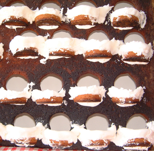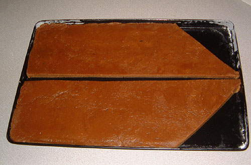 - Pour faire le toit, préparez à nouveau une fournée de pain d épices (recette-ci-dessus) puis étalez votre pâte sur le moule et coupez en deux votre pâte par le milieu et coupez le bout pour faire la pointe du toit (voir photo). Puis faire cuire pendant 15 minutes.