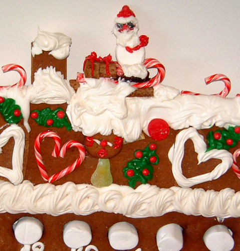 Puis vous prendrez votre toit et vous le consoliderez en découpant deux petits morceaux de pain d épice que vous collerez toujours avec le glaçage.