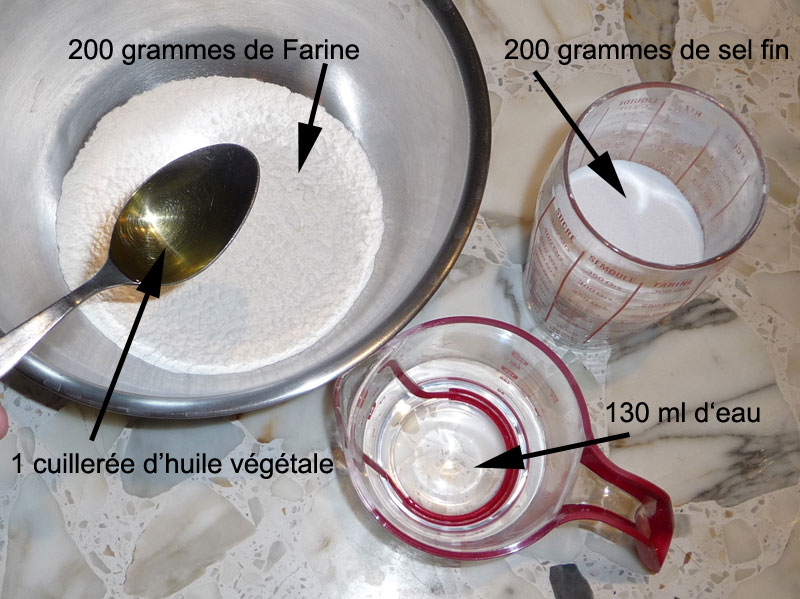 tout usage, 200 grammes de sel très fin,130 ml d' eau et 1