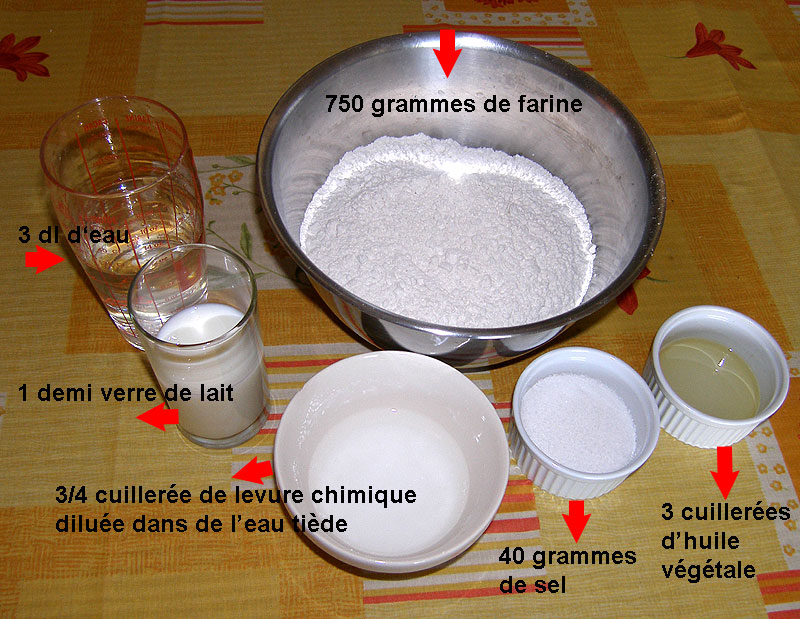 grammes de farine, le demi verre de lait, 40 grammes de sel fin, 3