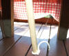 attachez votre ficelle dans la fente pour bien le faire tenir, faites un noeud et passez le fil sous votre table et sur votre table.