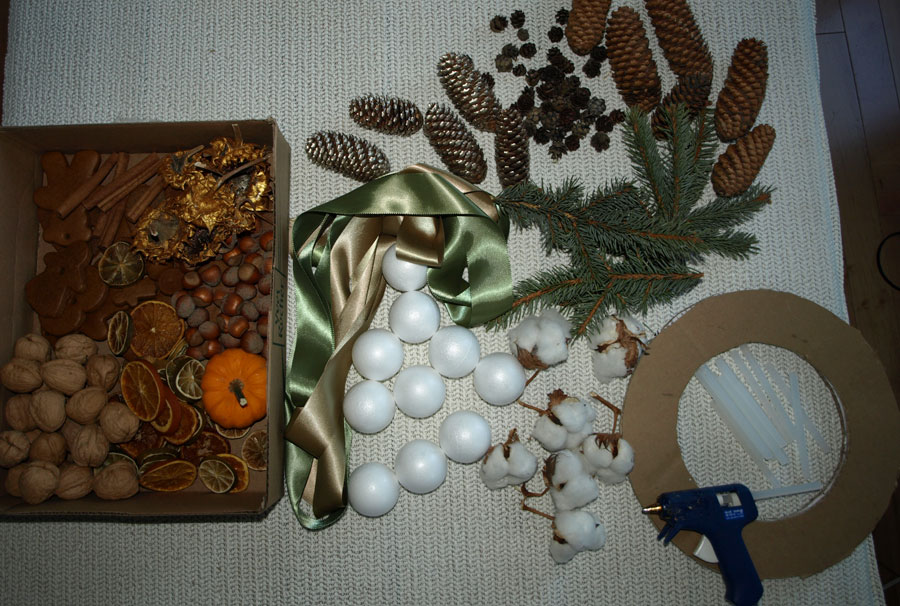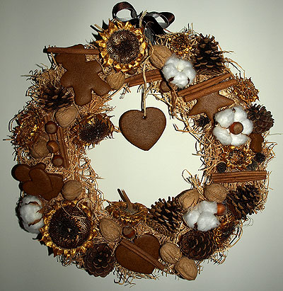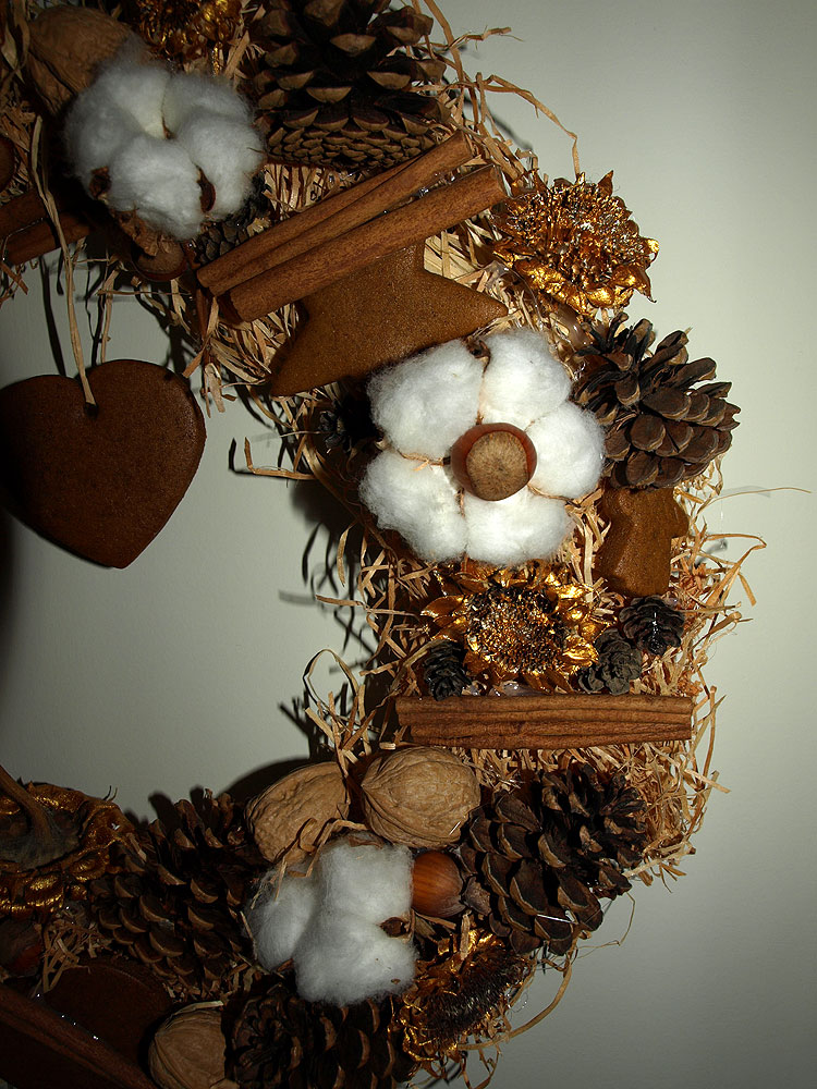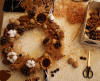 Comment faire une couronne de Noël avec des fruits secs, du pain d'épices, du raphia,