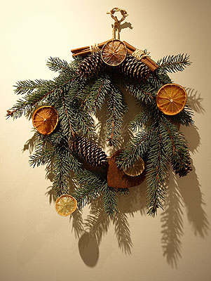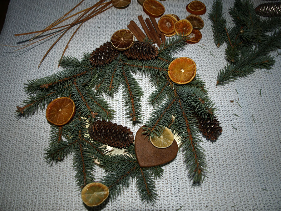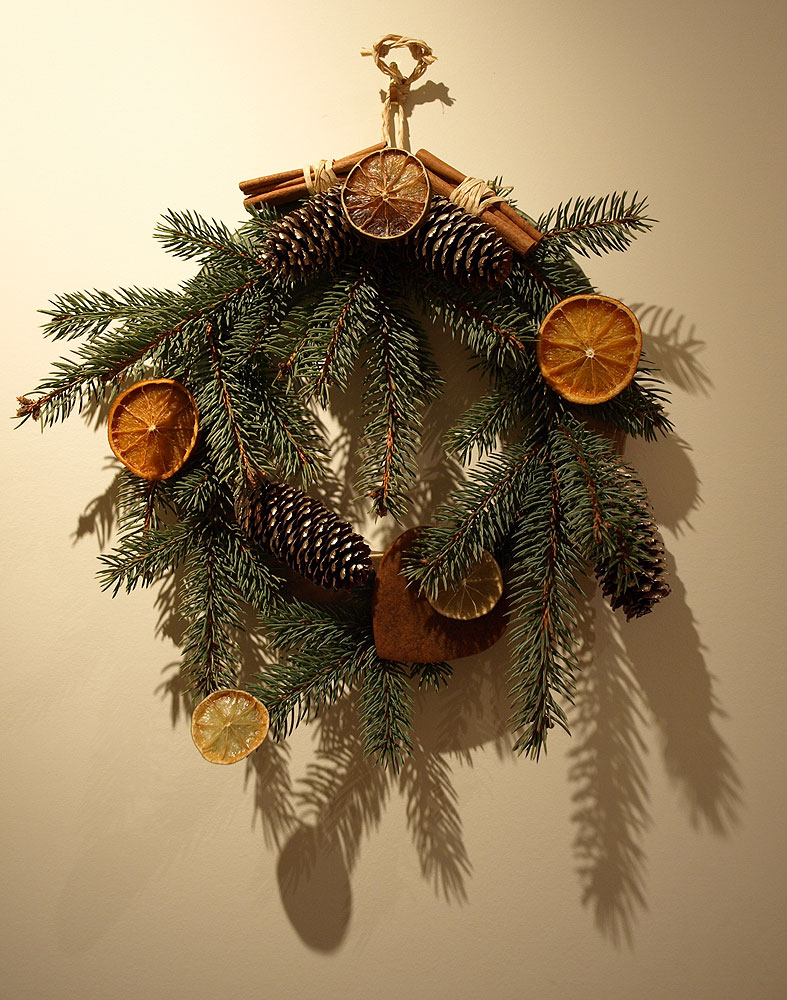 Pour cette couronne nous avons utilisé les bouts de branche de sapin des oranges et citrons séchés cannelle et pain d épices et pommes de pin.