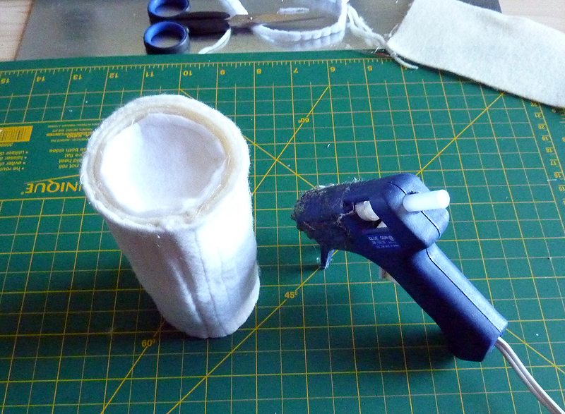 une machine à coudre, du fil blanc, un pistolet à colle, une paire de