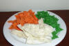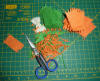 couleur orange une verte et une beige. une paire de ciseaux du fil de