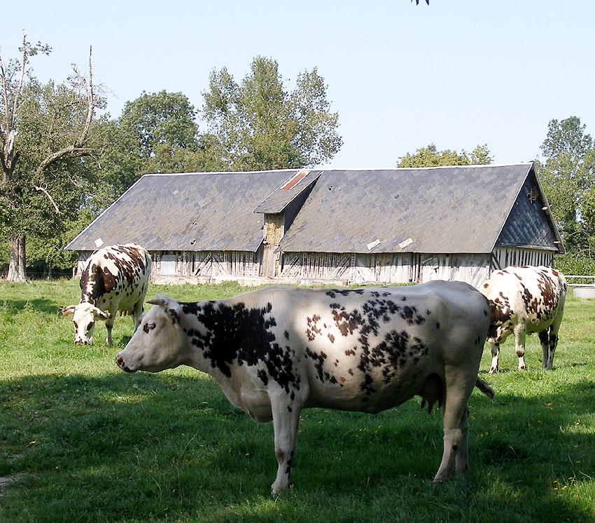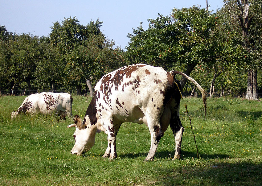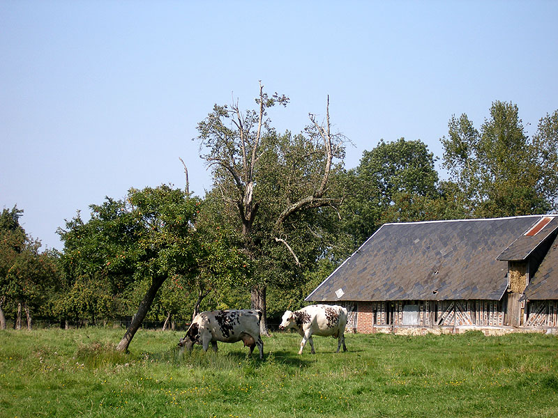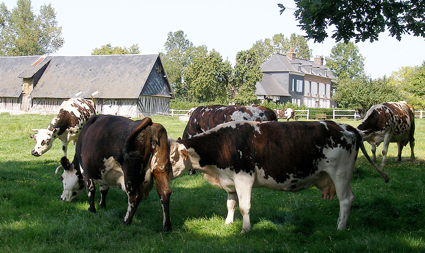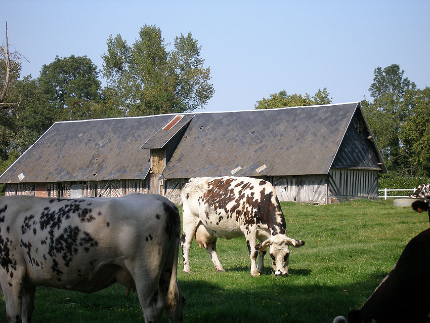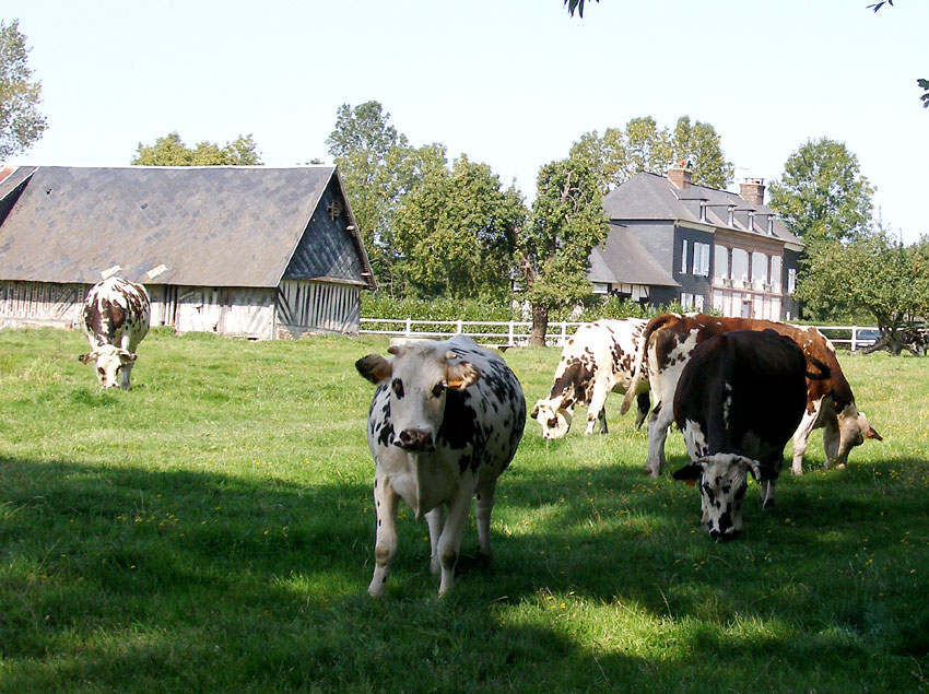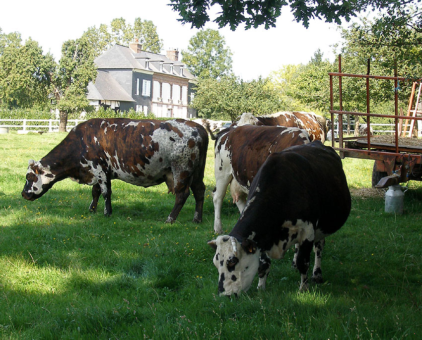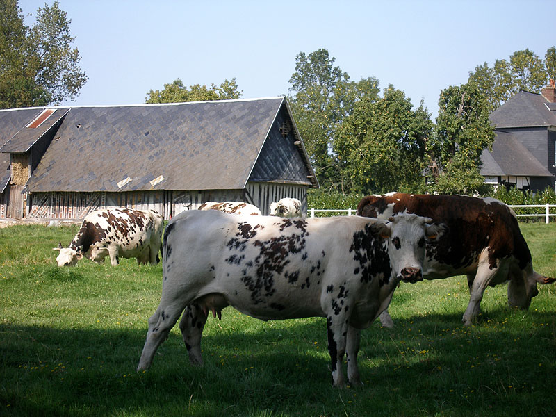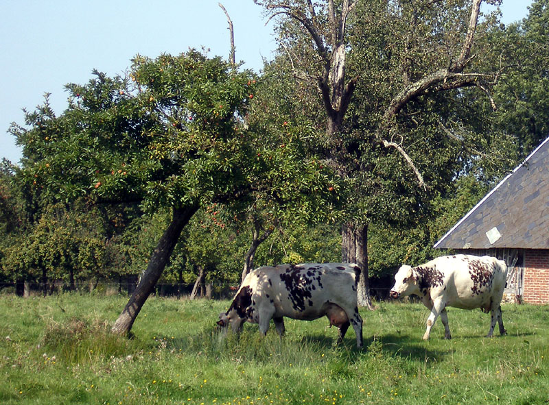 Photos de belles vaches paissant bien tranquillement dans leur pré normand.