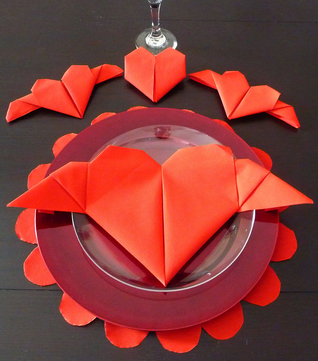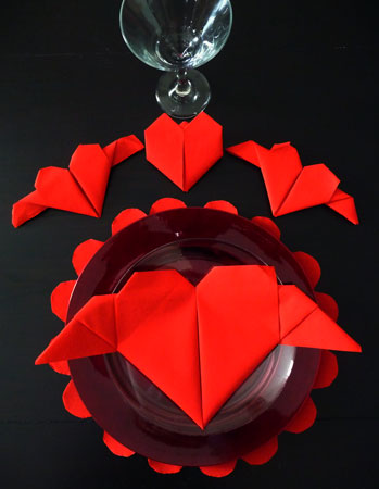 Pliage de serviette en papier en forme de coeur avec ses ailes. Pour votre repas de Saint-Valentin ou fêter un anniversaire.