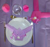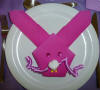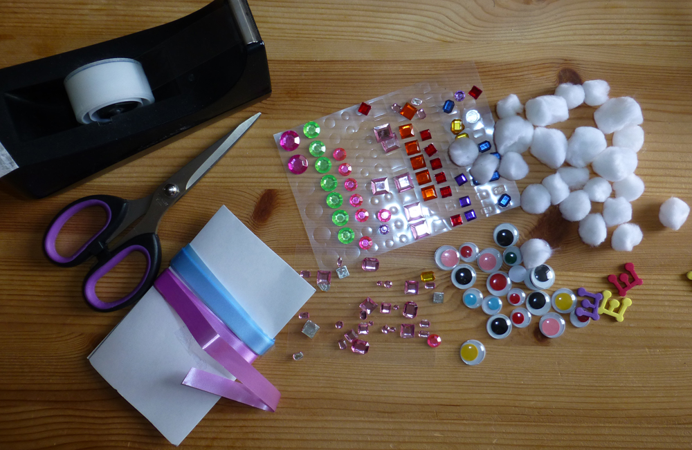 8) Utilisez du ruban adhésif double face pour coller un morceau de ruban pour les moustaches, un pompon pour le nez et des brillants pour les yeux.