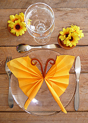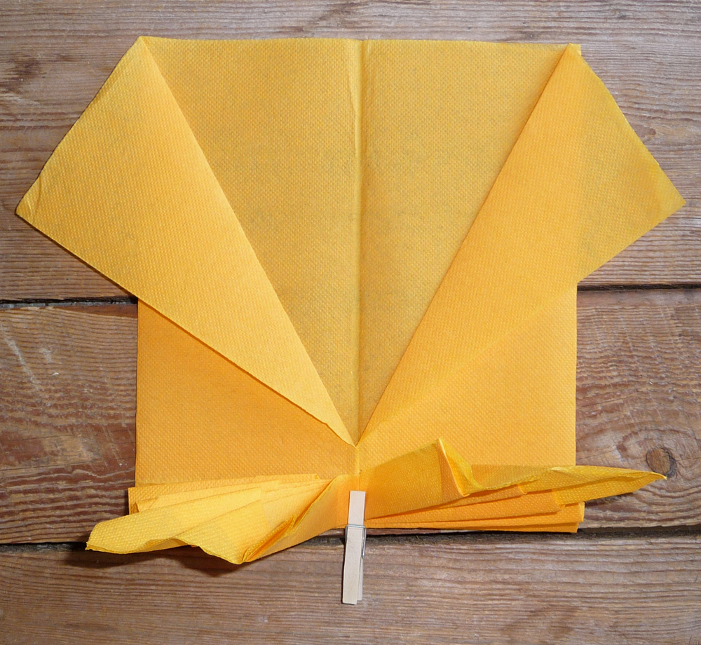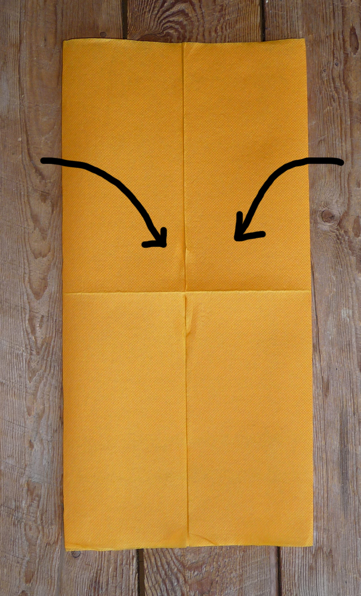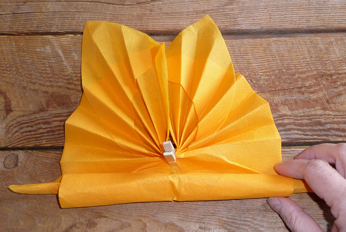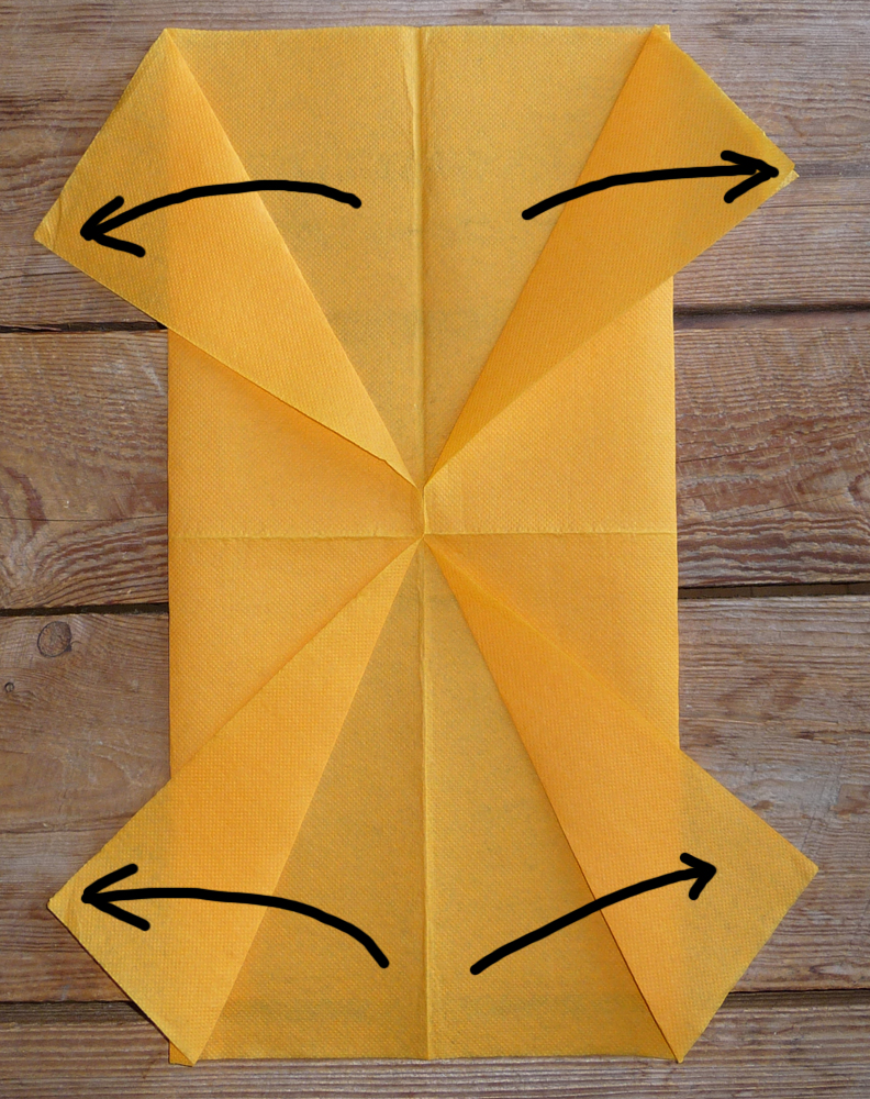 3) Ramenez les quatre coins vers l'exterieur en suivant la diagonale qui va du centre de la serviette au coin.