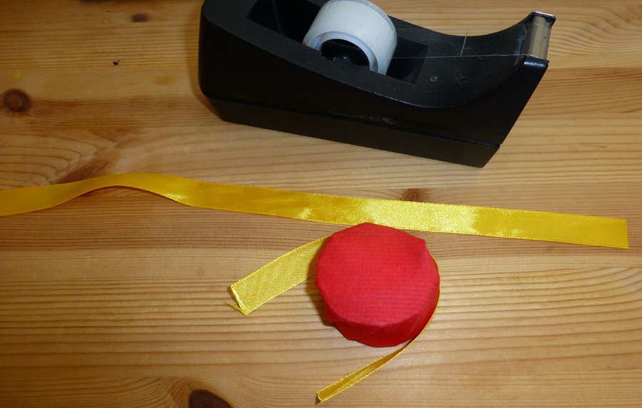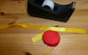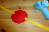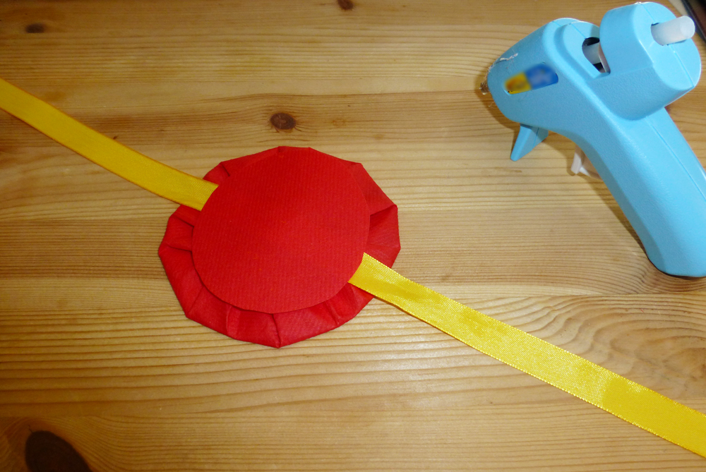 7) Coller à l’aide de votre pistolet à colle le ruban jaune puis collez le petit cercle rouge sur le ruban adhésif.