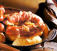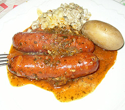 Saucisses savoyardes avec une sauce aux oignons et au vin blanc servis avec des pommes de terre vapeur.