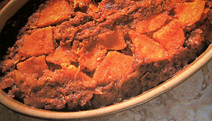réservant 1/4 pour gratiner; étaler dans un plat à gratin beurré,