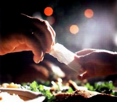 la table, on rompt le pain qui ressemble aux hosties lors de la