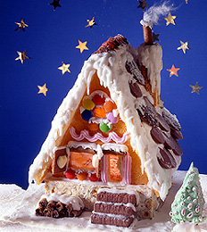 Pour les cheminées, alignez tout en haut du toit tes cubes de guimauve piqués sur des cure-dents.