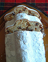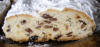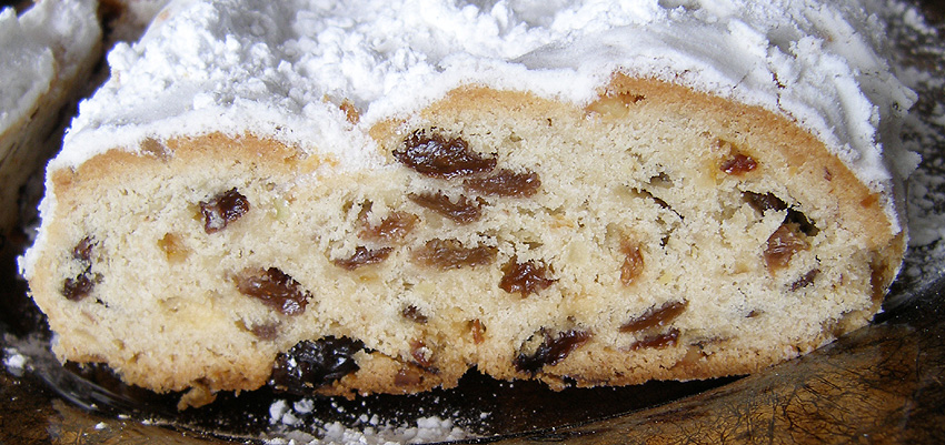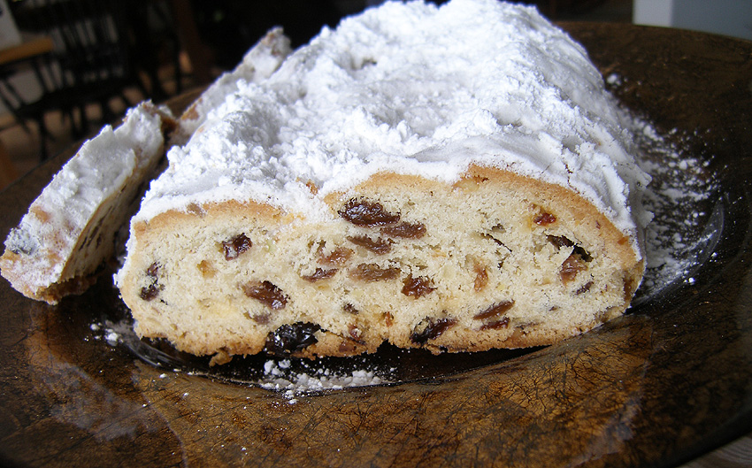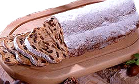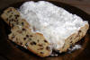Il existe plusieurs variétés de "Stollen" dont celui qui ressemble à une grosse crêpe fourrée. C'est en fait un gâteau truffé de fruits confits macérés dans le rhum, farci d'une crème d'amande et replié pour emprisonner la farce.