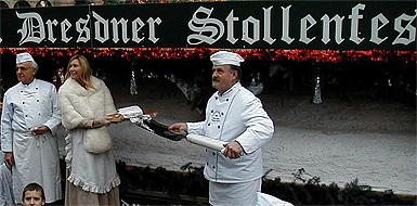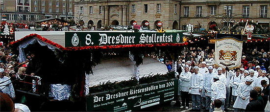 Et aussi vous pourrez gouter au : le "Stollen géant" (200 kg) que les pâtissiers présentent lors du "Dresdner Stollenfest" le 6 décembre et qui en longueur correspond à l’année en cours.