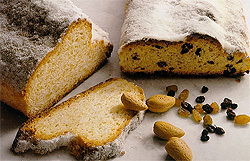 C'est un pain aux fruits farci au massepain, servi chaud ou froid. Le plaisir est décuplé le lendemain, au petit déjeuner, alors qu'on mord dans une tranche grillée et bien beurrée.