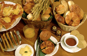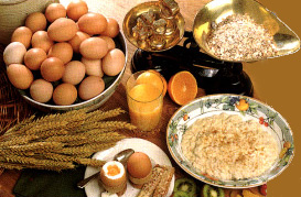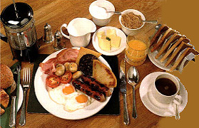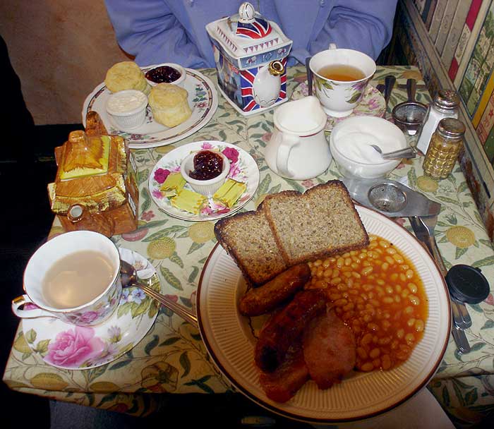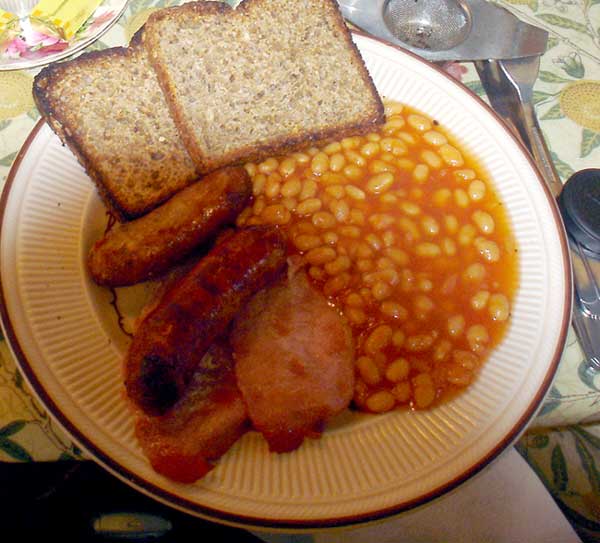 repas, complet et qui comprend traditionnellement un plat de céréales ou de porridge (bouillie d'avoine au lait), des œufs au bacon, des saucisses, du poisson, souvent des baked beans (haricots en sauce) et du black pudding (boudin noir). Le tout accompagné de toasts beurrés et de marmelade d'orange. Comme boisson, thé ou café au lait et bien sûr des jus de fruits.
