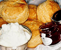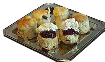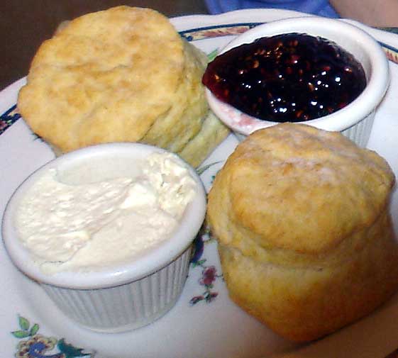 Les fameux scones servis avec de la confiture de framboise et la fameuse crème fouettée appelée CLOTTED CREAM