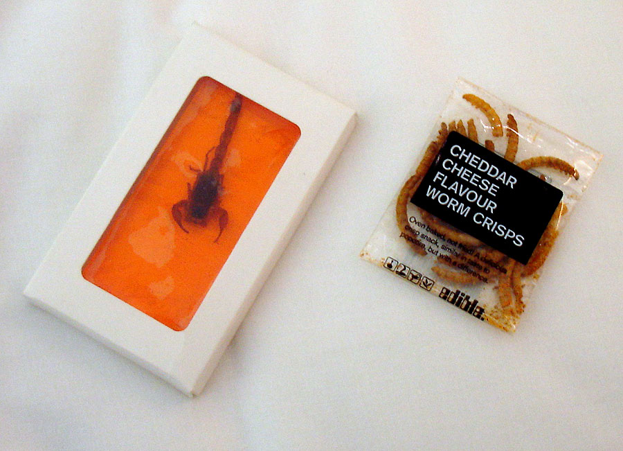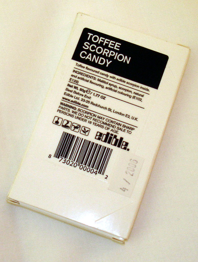 également ces sucettes au scorpion à qui on a retiré le dard d 'après le fournisseur voir le site www.edible.com pour de plus amples informations.