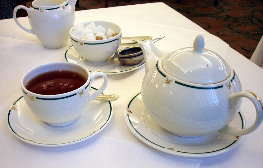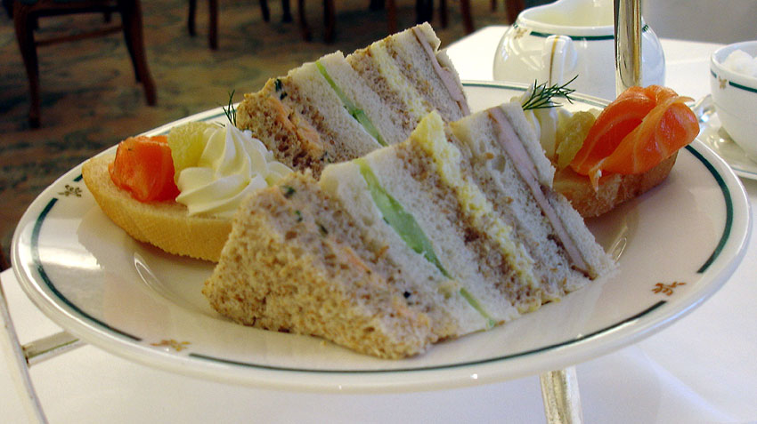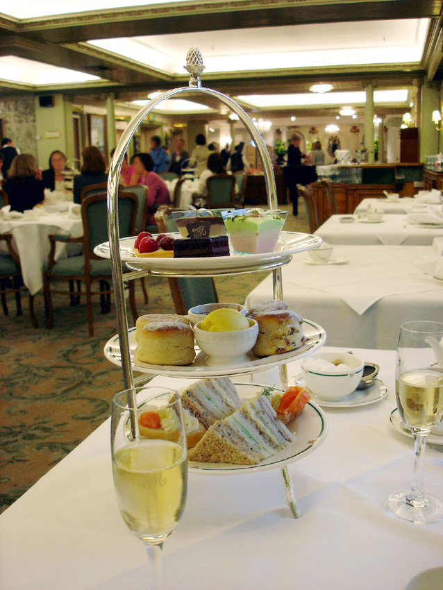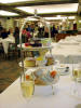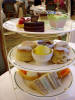 Sur le présentoir : un choix de crèmes, au milieu scones avec crème et marmelades et étage du bas les sandwiches au concombre au saumon au crevettes.