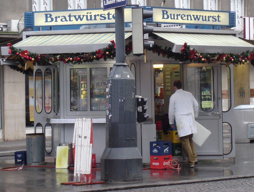 Kiosque de vente de sandwiches aux saucisses.