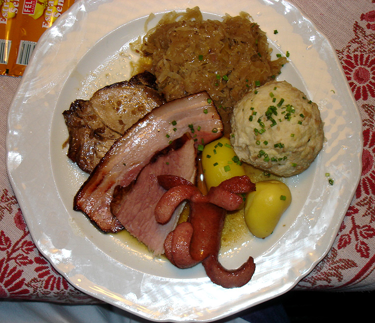 Assiette de choucroute, pommes de terre, knödel, lard, tranche de rôti de porc et saucisse de Francfort.