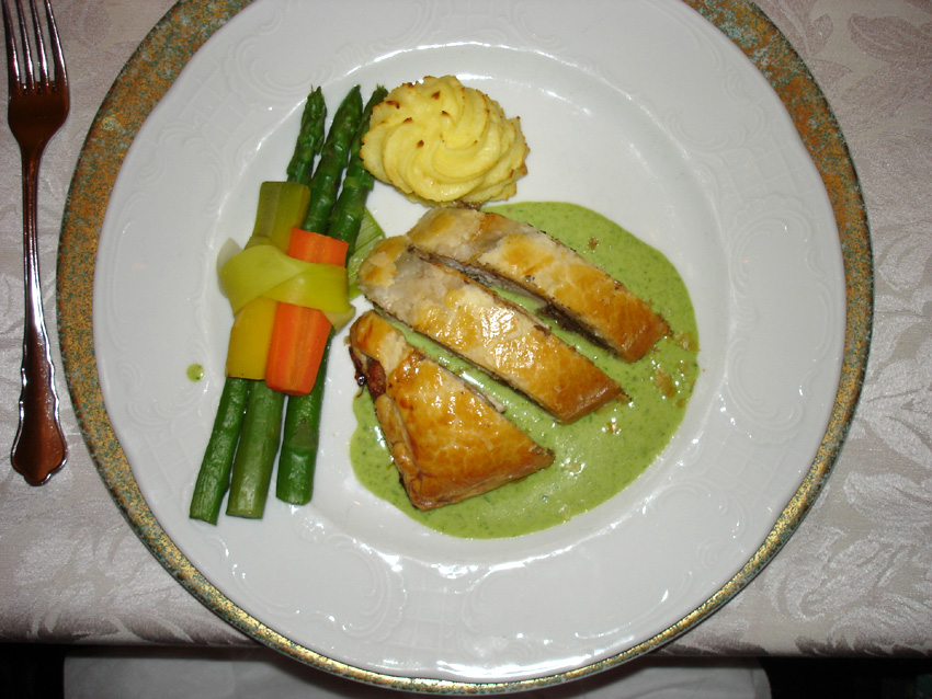 Le poulet en crôute avec sa sauce au persil et petits légumes.