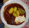 Goulache de boeuf au paprika et pommes de terre cornichons et oeuf sur le plat.