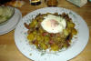 Boeuf en sauce avec pommes de terre et oignons frits.
