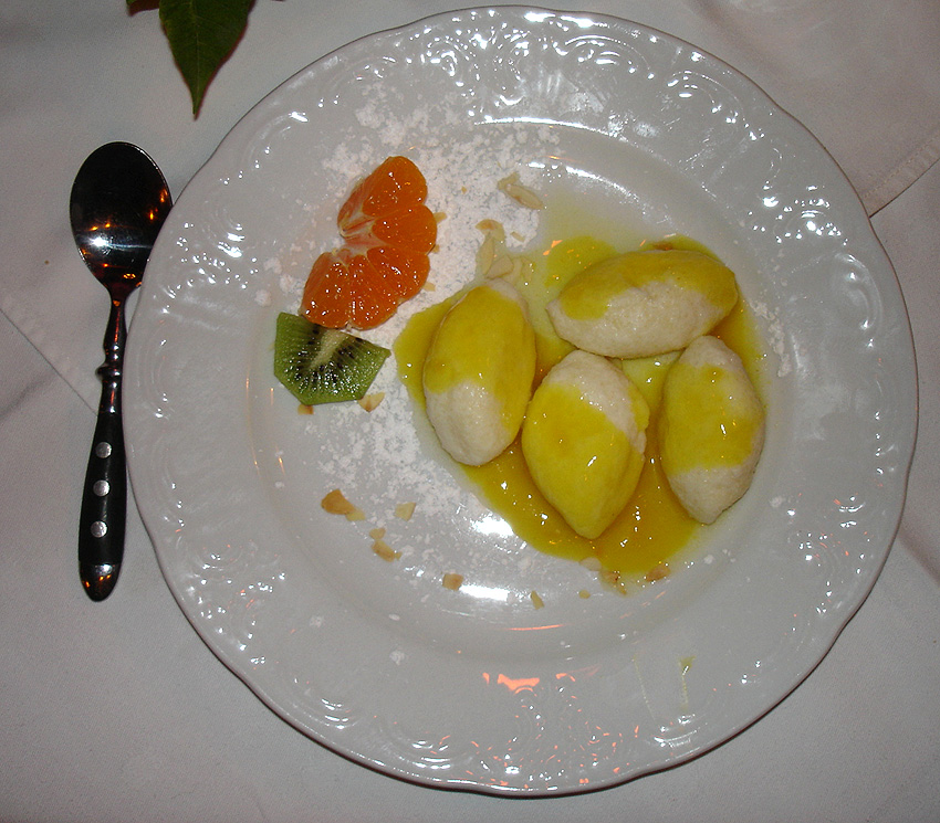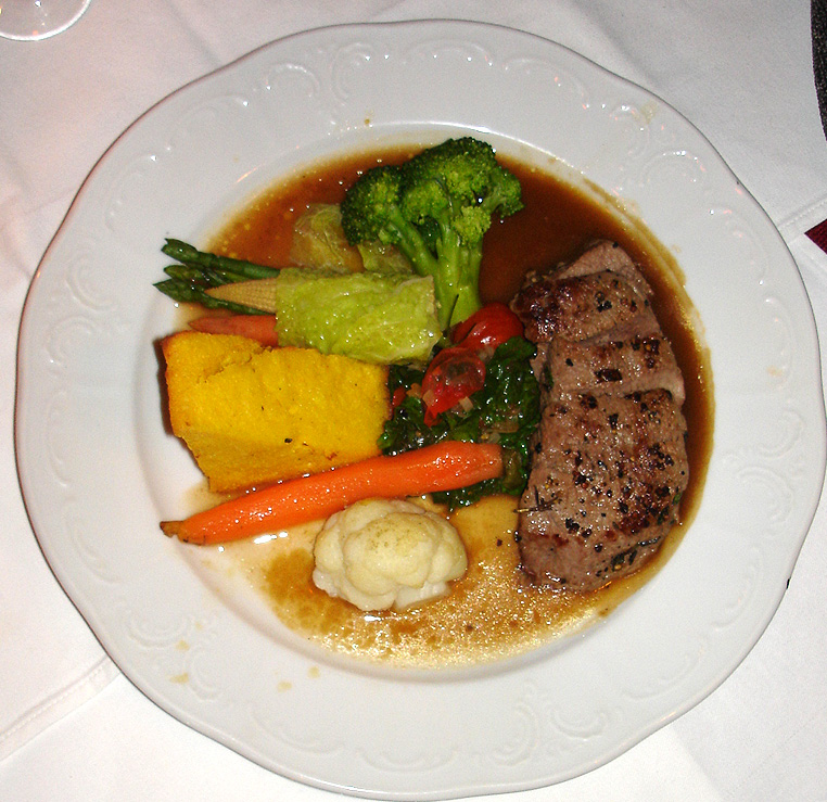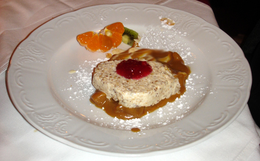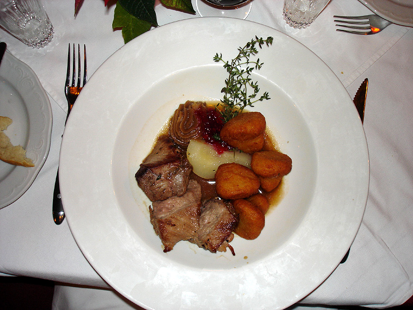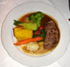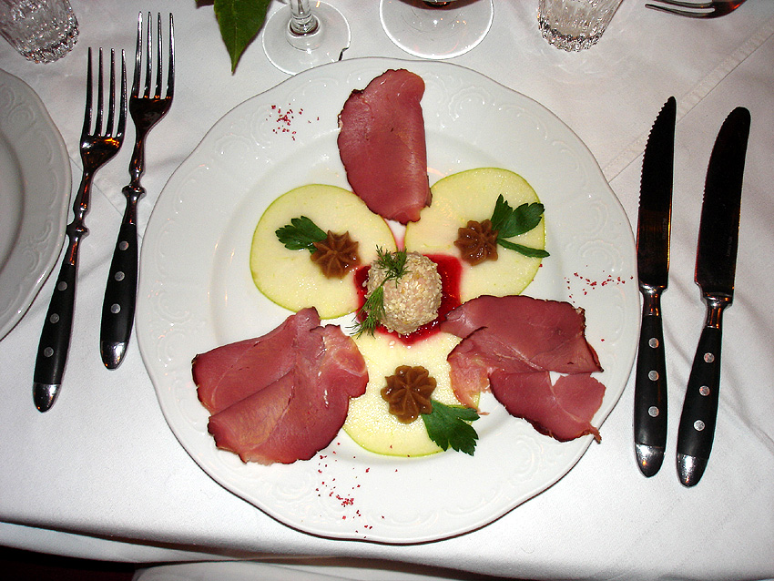 Une entrée : fines tranches de pomme, viande de sanglier fumée, foie gras et graines de cumin et crème de marrons.