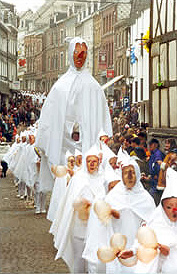 Blancs-Moussis - vêtus de la cape et du capuchon blancs, affublés du long nez rouge et entourant leurs géants, leurs échelles et chars souffleurs de confettis, ces festivités durent trois jours (du samedi au lundi soir). L'origine des Blancs-Moussis serait un édit du prince-abbé G. de Manderscheidt qui, en 1499, interdit à ses moines de participer au carnaval. Les Stavelotains tournèrent en dérision cette interdiction en participant aux festivités