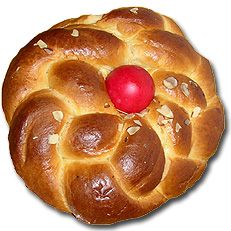 brioché appelé : pain tsoureki cuit avec des oeufs colorés en rouge.