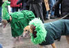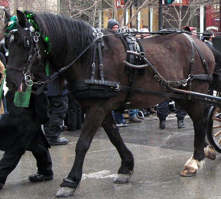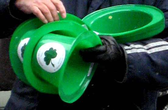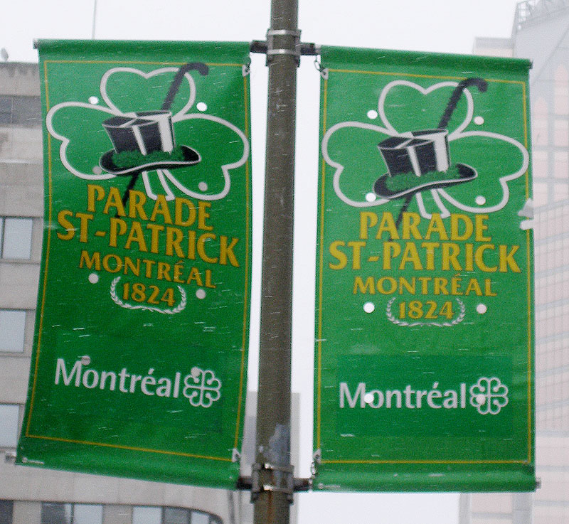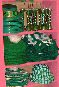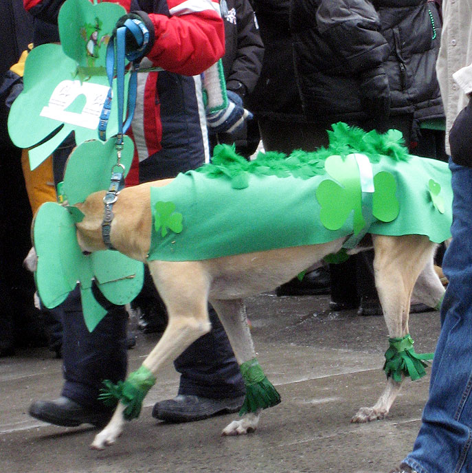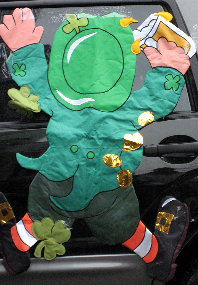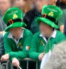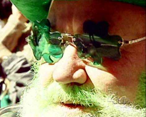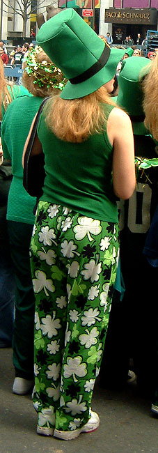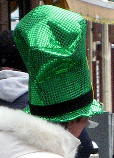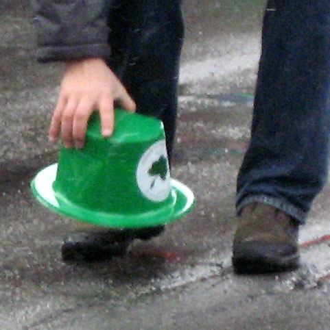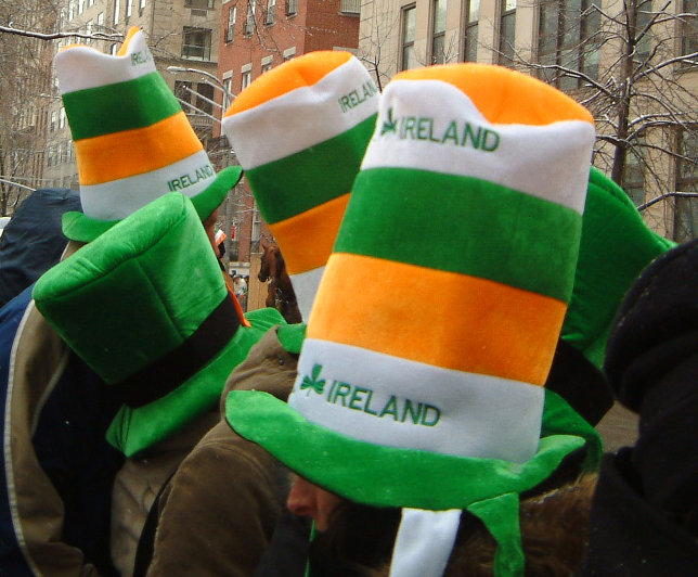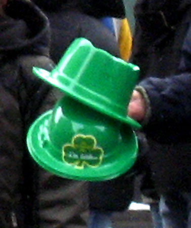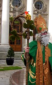 Saint-Patrick, les Irlandais se rendent à l'église, mangent du corned-beef (boeuf en boîte de conserve) avec du chou, organisent des parades ; la bière coule à flots dans les pubs et tout le monde s'habille en vert, couleur traditionnelle de l'Irlande, si possible un trèfle accroché à leur boutonnière le trèfle à trois feuilles est aujourd'hui un emblème national de l'Irlande, le pays aux verts pâturages.