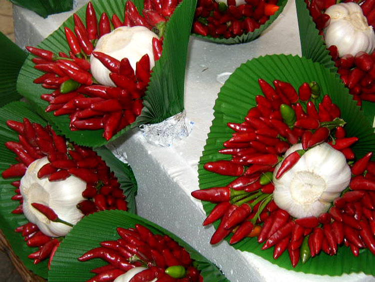 Jolie présentation de petits piments et d'ail.