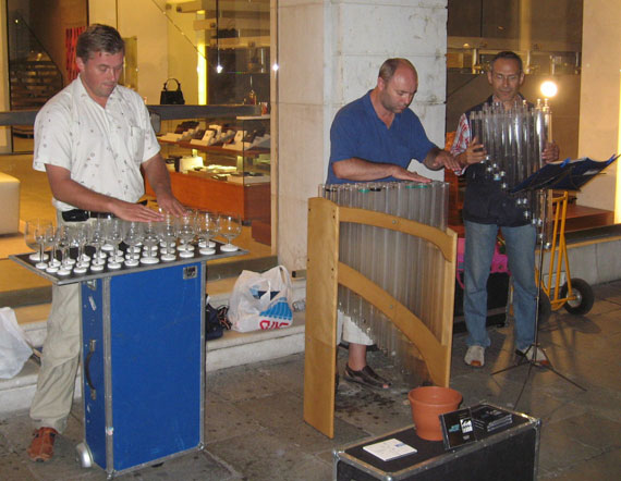 Groupe d'artistes utilisant du verre pour jouer des airs de musique.