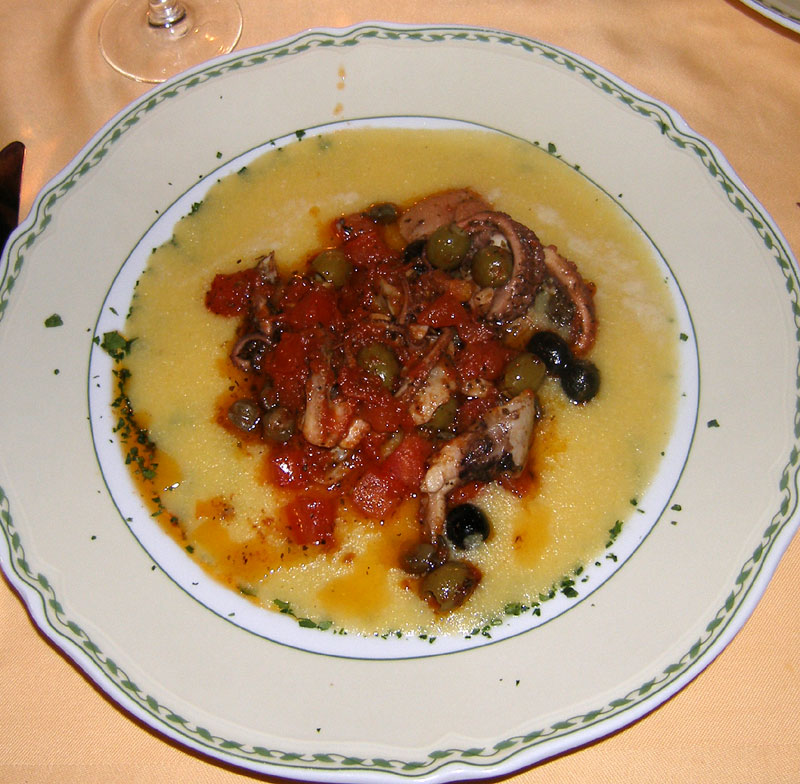 polenta aux calamars avec olives champignons et tomates