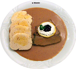 un rôti de bœuf à la crème, servi avec des airelles et de la crème fouettée.