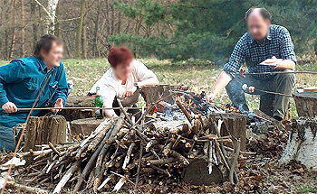 un barbecue en pleine nature autour d' un bon feu de bois.