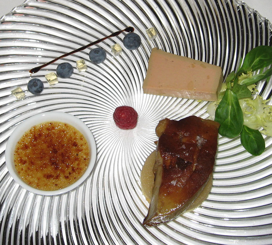 Assortiment de 3 préparations à base de foie gras : foie gras frais poêlé, crème brûlée au foie gras et pâté de foie gras.