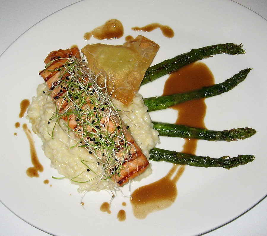 Risotto aux asperges vertes et darne de saumon frais.